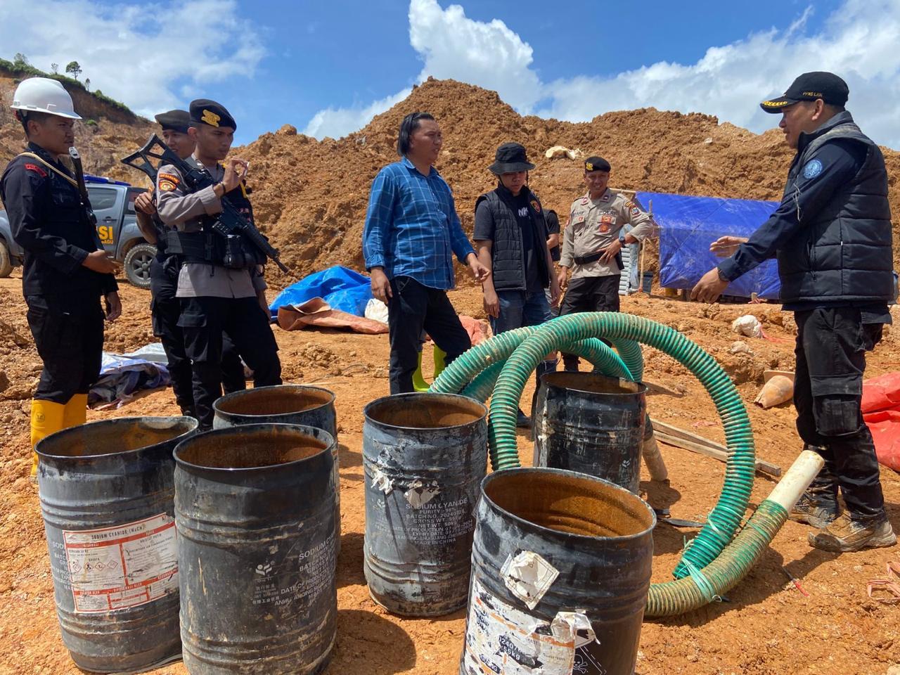 Setibanya di lokasi utama, tim mendapati indikasi kuat aktivitas tambang liar. Kondisi kawasan tersebut menunjukkan bukti yang tidak terbantahkan. Beberapa kolam perendaman material emas terlihat tersebar di antara tutupan vegetasi, disertai tong-tong bekas sianida, selang-selang panjang, serta peralatan pendukung lainnya yang mengindikasikan adanya operasi pengolahan emas secara terstruktur.